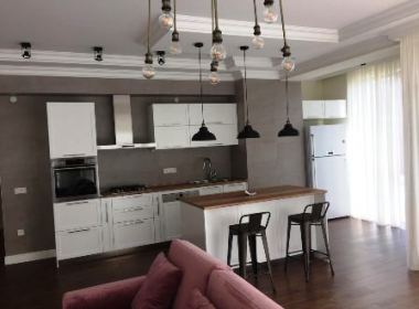 3-roomed 119 sq.m. apartment for rent in Saburtalo, on Burdzgla str, in new building, on the 9th floor, new renovated, with central heating, studio type kitchen, furniture, technique, telephone, internet, metal door, balcony
