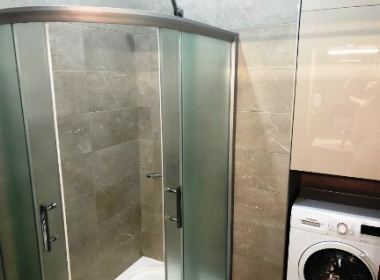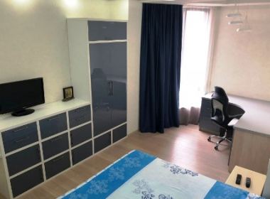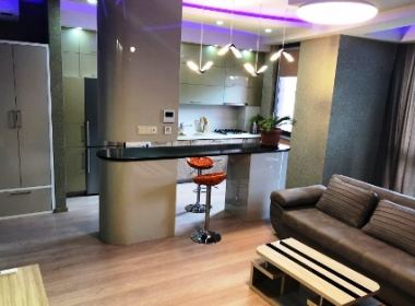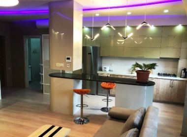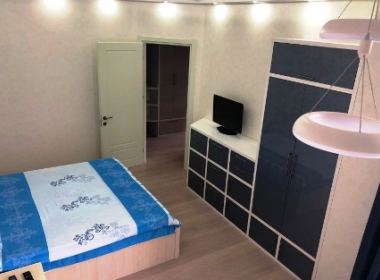 2-roomed 65 sq.m. apartment for rent in Bagebi, on Tskneti highway, in new building, on the 6th floor, new renovated, with central heating, air-conditioner, studio type kitchen, furniture, technique, telephone, internet, metal door, balcony, parking