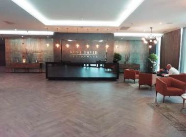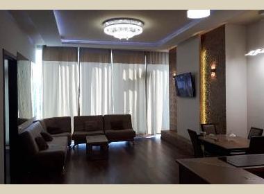 3-roomed 85 sq.m. apartment for rent in Saburtalo, on Alexidze str, in new building of King David, on the 8th floor, new renovated, with central heating, air-conditioner, open plan living room, all furniture and technique, telephone, internet, balcony with excellent views, 2 lifts, concierge service