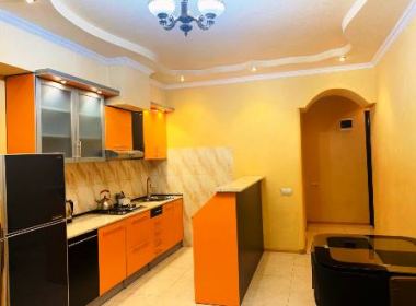 2-roomed 75 sq.m. apartment for rent in Vake, on Abashidze str, on the second floor, new renovated, with open plan living room, central heating, air-conditioner, furniture, technique, telephone, internet, metal door, balcony, place for parking