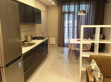 2-roomed 55 sq.m. apartment for rent in Vake, on Marabda str, in new building, on the 6th floor, new renovated, with open plan living room, central heating, air-conditioner, furniture, technique, telephone, internet, metal door, balcony