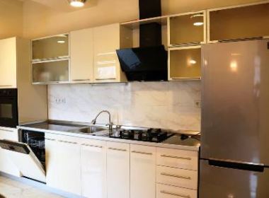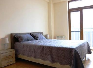 3-roomed 100 sq.m. apartment for rent in Vake, on Chavchavadze ave, in ne building, on the second floor, new renovated, with open plan living room, central heating, air-conditioner, 2 bathrooms, all furniture and technique, telephone, internet, 4 balconies (20 sq.m.), closed yard with security