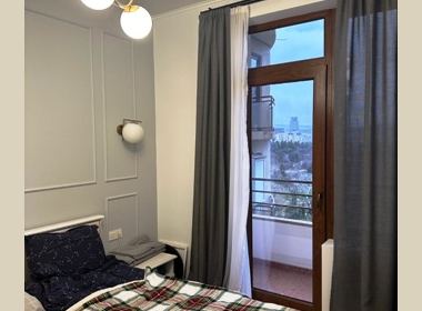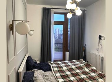 2-roomed 55 sq.m. apartment for rent in Vake, on Ramishvili str, in new building, on the 4th floor, new renovated, with central heating, air-conditioner, furniture, technique, internet, balcony with vew of Mziuri park