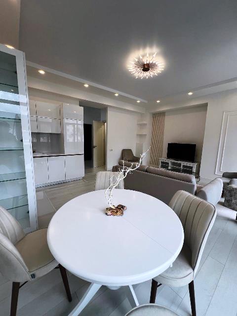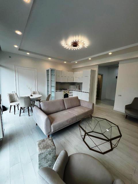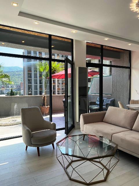 3-roomed 100 sq.m. apartment for sale in Saburtalo, on Mindeli str, in new prestigious complex Mindeli Diamond, on the 4th floor, new renovated, with central heating, air-conditioners, 2 bathrooms, furniture, technique, internet, 2 balconies with beautiful views, 3 lifts, concierge service