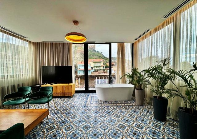 Operating high-class hotel for rent in Old Tbilisi (Abanotubani), 4-story 760 sq.m. building, 15 rooms, furnished to high-end modern standards, equipped with modern furniture and appliances, verandas with beautiful views of Old Tbilisi