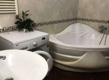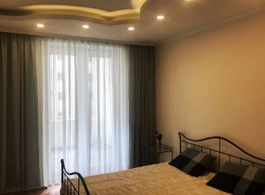 4-roomed apartment for rent in Saburtalo, on Kostava str, near the Sports Palace, in new building, V floor, 3 bedrooms, living room, study, billiard room, large lounge, separate large kitchen, 2 bathrooms, renovated, with central heating, 2 air conditioners, furniture, appliances, telephone, internet, metal door, 4 balconies, large veranda, garage, security in the building