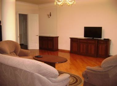 4-roomed apartment for rent in Saburtalo, on Chikovani str, in new building, on the 6th floor, total space - 130 sq.m., new renovated, with isolated kitchen, 2 bedrooms, cabinet, 2 bathrooms, furniture and technique, plsma TV, central heating, hot water, air-conditioner, telephone, internet, metal door, 2 balconies, lift, underground autoparking